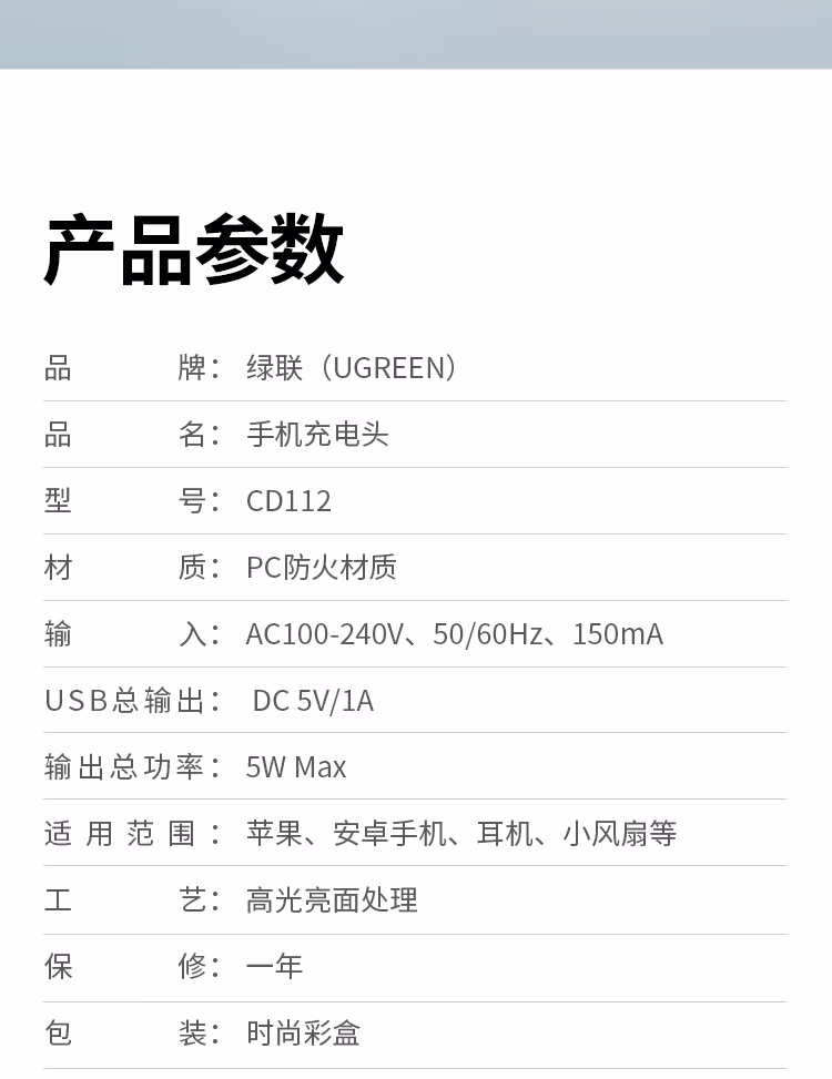 绿联5v1a充电器USB插座充电头 (单位:个)