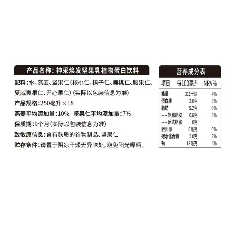 统一(Uni-President)神采焕发坚果乳植物蛋白材料250mL*18(单位:箱)