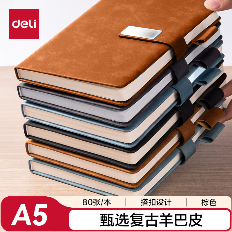 得力(deli)笔记本子A5/80张羊巴皮记事本商务办公皮面本加厚工作笔记本复古皮面本棕BP153 单位:本