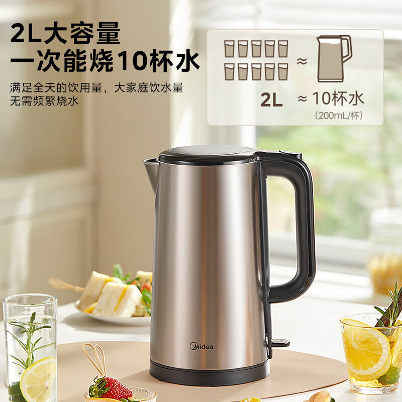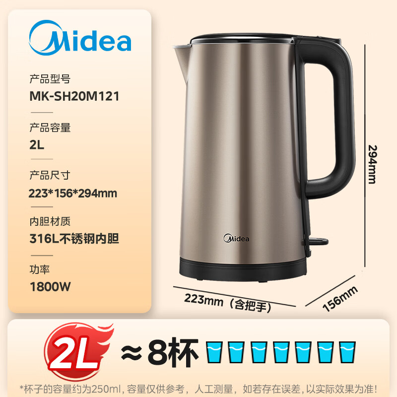 美的电水壶热水壶 2L全钢无缝双层防烫烧水壶大容量电热水壶316L不锈钢1800W大功率SH20M121